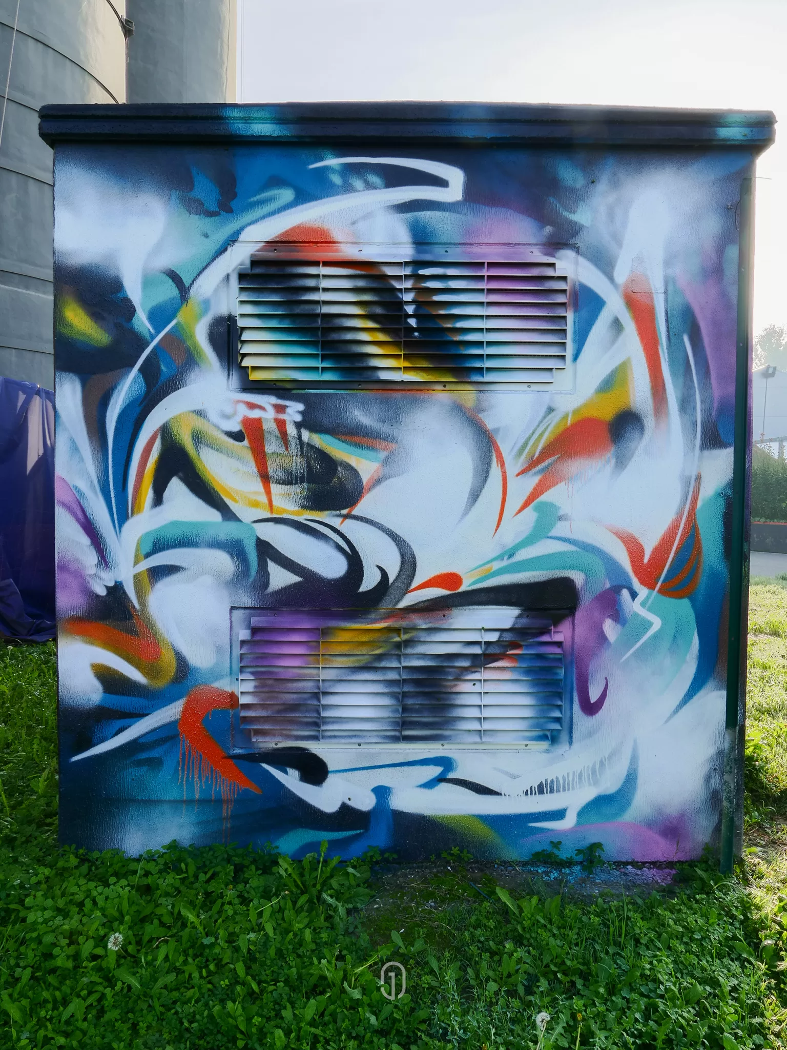 L’idea alla base dell’intervento è la contrapposizione tra spettatore e velocità, tra antichi modi di vedere le cose e il progresso, passato e futuro. Sulla parete più grande si trova un volto femminile dai colori marmorei, simbolo dell’immobilismo sugli spalti, e una motocicletta rappresentata nello stile futurista di Umberto Boccioni sfrecciare velocissima dal lato opposto. Nella parete di fronte, proprio a guardare questa contrapposizione, si trova il volto di un bambino con in mano un binocolo intento ad osservare una gara motociclistica. Nel riflesso delle lenti vediamo due moto che sfrecciano in curva. Sui lati più piccoli delle cabine, invece, troviamo rispettivamente due rose interpretate con uno stile astratto, per creare un’atmosfera più colorata ed accattivante allo sguardo, mentre sulla parete frontale all’ingresso della pista go-kart ho disegnato un pilota intento a guidarne uno. Tra il volto della bambina e la motocicletta del futurismo italiano si trova la scritta “circuit” in inglese, anch’essa molto astratta e molto dinamica, per riprendere l’idea della velocità.