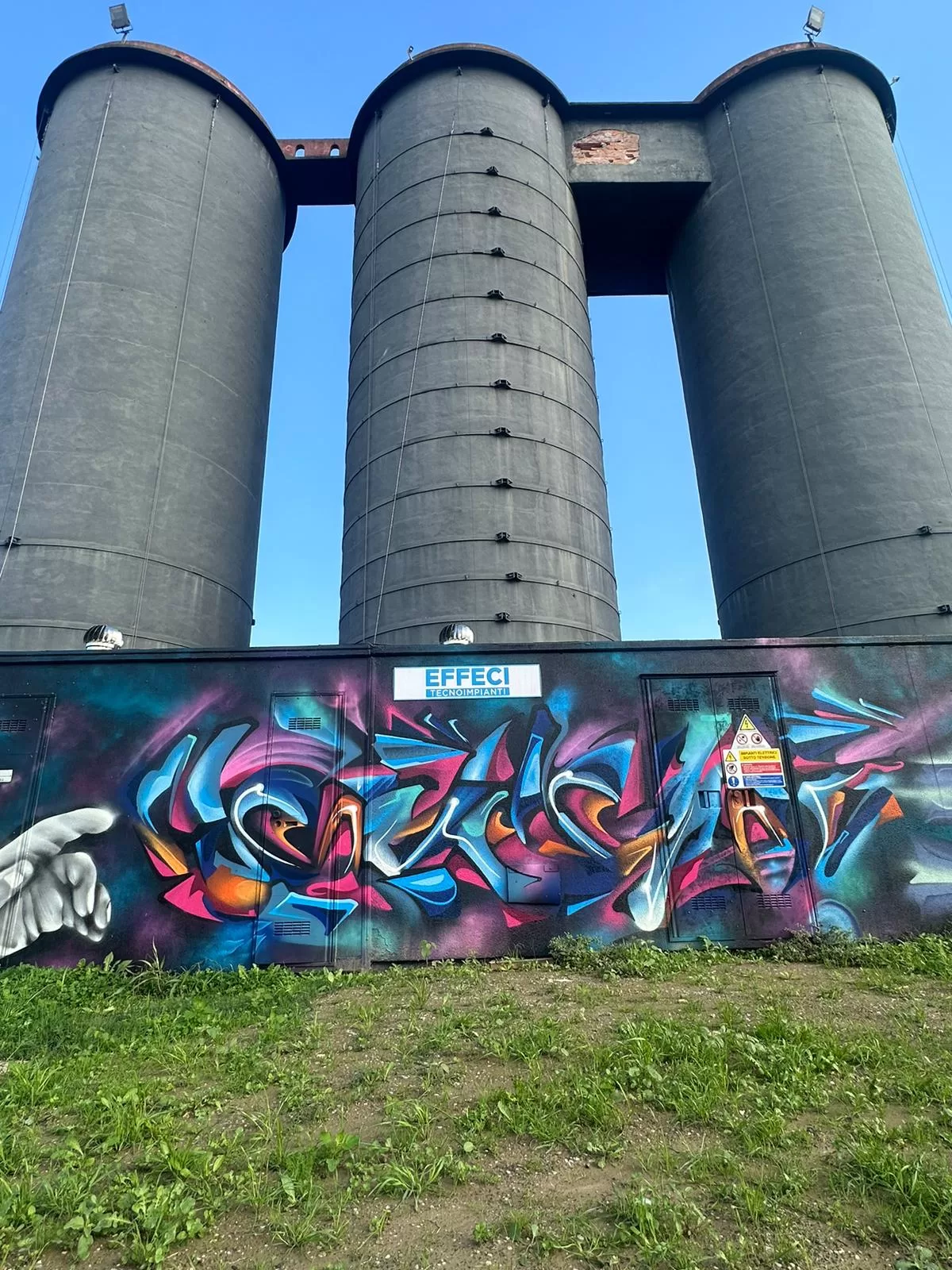 La richiesta è stata quella di trasmettere la velocità e l’adrenalina che i piloti si trovano a vivere mentre gareggiano, riqualificando le cabine di alimentazione poste all’interno del circuito, più precisamente all’ingresso della pista dei go-kart. Sicuramente è stata una grande sfida carica di responsabilità e orgoglio realizzare in poco tempo queste pareti, mentre l”impianto di gara stava operando un corposo restyling in vista del grande appuntamento. Infatti quasi 45.000 persone in quel fine settimana, tra una corsa e l’altra, hanno potuto godere dello spettacolo motociclistico e ammirare i lavori. E mi fa enorme piacere aver potuto togliere il grigiore e portare il colore in maniera così dinamica, slanciata, con questi contrasti cromatici e rendere quel luogo di passaggio molto più vivo.